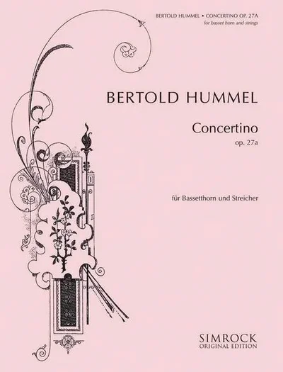 Bertold Hummel composed the Concertino for basset horn in 1964. The piece is characterised by the use of French folk song melodies, which are incorporated into its own thematic material. In the first movement - Prologue - the solo instrument appears in recitative-like declamation. The Concerto, the second movement, is based on the meaning of the word "concertare" = "to compete", in that the soloist and string ensemble are brought together "competitively" to form an overarching unit. The short epilogue is a fading away in a strict alternation of basset horn and strings.