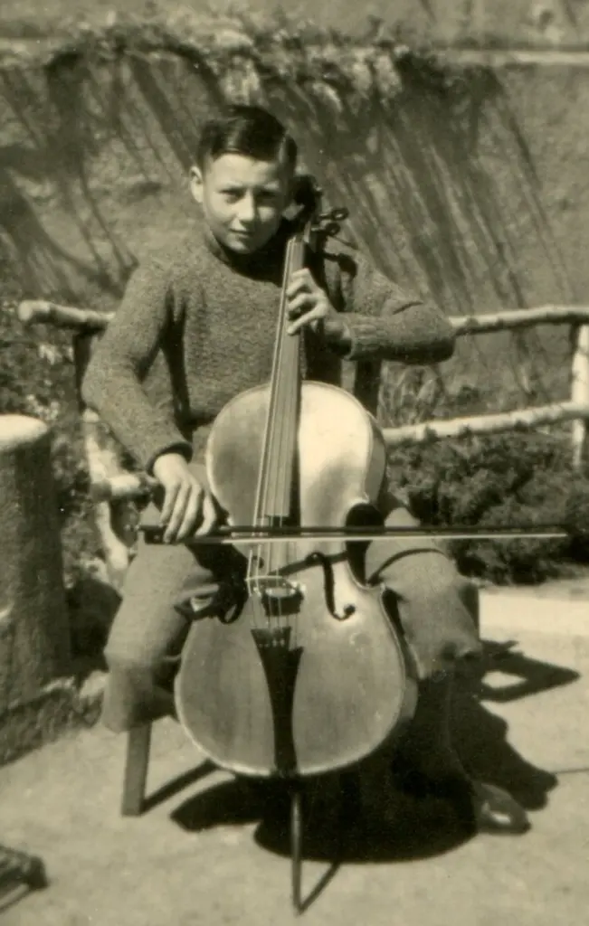 L'entrée à la Rotteck-Oberrealschule de Fribourg en 1936 marque le début d'une nouvelle période de sa vie. Le professeur de musique Wilhelm Weis reconnaît immédiatement le talent particulier du sextant et veille à ce que Bertold Hummel reçoive des cours de violoncelle; (photo: 1936) il lui donne lui-même en privé des cours d'harmonie et de composition. La visite d'un concert symphonique, que l'élève a refusé à ses parents, est un événement clé. La "Troisième" de Bruckner est au programme. Son enthousiasme est sans limite et il décide de devenir compositeur ! Cette décision prend un nouvel élan lorsqu'il chante régulièrement dans le chœur de garçons dans le "Parsifal" de Wagner lors d'une représentation des scènes municipales de Fribourg. Avec Wagner et Bruckner, les premières étoiles fixes, qui ne se sont pas éteintes jusqu'à aujourd'hui, se sont levées dans le ciel pour le jeune étudiant. Entre-temps, plusieurs compositions ont vu le jour, certaines ont été essayées lors de concerts scolaires et présentées à un petit public, si bien que l'on décide d'en soumettre quelques-unes à l'appréciation du compositeur Julius Weismann, qui vit à Fribourg. Celui-ci accepte sans hésiter de se charger de l'enseignement de la composition, mais les circonstances de la guerre mettent fin trop tôt à cette formation de l'élève. Le musicien en herbe subit des préjudices personnels lorsque sa participation de longue date à la musique domestique est dénoncée auprès d'une famille juive de renom à Fribourg. A dix-huit ans, il est enrôlé dans le "Reichsarbeitsdienst" et, six mois plus tard, dans le service militaire. Il n'est pas question de perfectionnement musical.