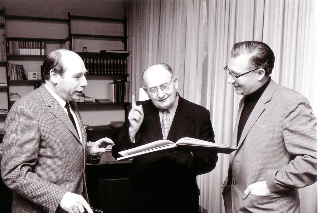 Fils d'organiste, ayant lui-même travaillé plusieurs années comme cantor et proche de l'archidiocèse de Fribourg, Bertold Hummel a également trouvé à Würzburg de bonnes possibilités de travail artistique dans le domaine de la musique d'église. Peu de temps après son installation à Würzburg, il crée une "Messe allemande" pour solistes, chœur, paroisse et grand orchestre à l'occasion de la restauration de la cathédrale de la métropole de la Franconie du Main en 1967. Quatre ans plus tard, les "Métamorphoses sur B-A-C-H" pour onze instruments à vent et orgue sont créées dans la cathédrale - une œuvre de commande de la Société Bach de Würzburg, fraîchement fondée sous la direction de Günter Jena. Le point culminant de ces œuvres créées jusqu'à présent pour la cathédrale de Würzburg est l'oratorio "Der Schrein der Märtyrer", achevé et créé en 1989 à l'occasion du 1300e anniversaire de la mission et du martyre des apôtres francs, sur un texte de l'évêque Paul Werner Scheele. Pour pouvoir venir à bout de cette grande œuvre de toute une soirée pour cinq solistes, un chœur mixte, un chœur de garçons, un narrateur, trois orgues, un ensemble de percussions et un grand orchestre, Hummel s'est fait libérer des obligations d'un directeur et d'un professeur d'université : en 1988, il quitte le service universitaire (photo: 1988), mais reste lié à l'établissement en tant que président d'honneur. C'est l'année où la ville de Würzburg lui décerne le prix de la culture, après l'avoir déjà élu à l'Académie bavaroise des beaux-arts (1982) (photo: 1982) et lui avoir décerné la Croix fédérale du mérite de 1ère classe (1985).