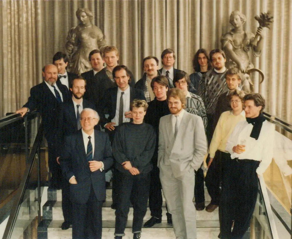 Le tournant décisif dans la vie et la carrière artistique de Bertold Hummel résulte de sa nomination en tant que professeur de composition au Conservatoire national de musique de Bavière de Würzburg en 1963. Certes, au cours des premières années, l'accent est mis plus ou moins exclusivement sur l'enseignement de la composition, du contrepoint, de la basse continue et du solfège, les matières dites obligatoires dans le canon de formation des chanteurs et des instrumentistes, mais il parvient à fidéliser les étudiants en composition en intégrant des analyses d'œuvres de musique contemporaine et à obtenir la création d'une classe de composition (photo: 1965). Par ailleurs, la première activité de Hummel à Würzburg se déroule à une époque où un certain nombre de collègues ouverts d'esprit sont prêts à soutenir ses efforts d'innovation. Les compositions des années soixante reflètent la rencontre avec des collègues comme le percussionniste Siegfried Fink et respirent le souffle d'expériences sonores inédites. Hummel trouve en Lotte Kliebert, la fille de l'ancien directeur de l'institut et compositeur Karl Kliebert, une personnalité engagée de Würzburg qui le convainc de diriger le "Studio für Neue Musik" nouvellement créé. Jusqu'en 1988, de nombreuses années de travail de développement responsable en matière de musique nouvelle s'ensuivent dans la ville épiscopale du Main, par ailleurs plutôt réticente face à la nouveauté. En faisant preuve d'une grande libéralité en matière de style et d'esthétique, il offre une plate-forme à Würzburg à toutes sortes de compositeurs, de Korn, Genzmer et Büchtger à Lachenmann, en passant par Hába (photo: 1967), Stockhausen et Rihm. Après un séjour de six mois à la Cité des Arts de Paris en 1968, il se voit confier le poste de directeur adjoint de l'Institut de formation musicale de Würzburg. Le directeur, Hanns Reinartz, obtient la construction d'un nouveau bâtiment pour le Bayerische Staatskonservatorium. Lorsque la salle de concert est inaugurée en 1966, la 2e symphonie "Reverenza" de Hummel résonne sous la baguette du maître des lieux. Lors de la transformation de l'institut en deuxième conservatoire de musique bavarois en 1973, Hummel devient professeur ordinaire et directeur d'une classe de composition. Désormais libéré des tâches liées à l'enseignement d'une matière obligatoire, il se consacre intensément à la formation de jeunes compositeurs et les aide, dans la mesure où son temps le lui permet, à trouver des possibilités d'exécution en plus de sa propre composition. Le fait qu'il n'y ait pas d'attachement épigonal des élèves au langage musical désormais très autonome de leur professeur peut être considéré comme un signe positif de la largeur d'esprit stylistique de Hummel. Au cours des vingt-quatre années d'enseignement qu'il a suivies jusqu'à son départ en 1988, Hummel a créé une sorte d'"école de compositeurs de Würzburg", dont les caractéristiques sont une éthique de haute technicité et une remarquable proximité avec la pratique. Des compositeurs à succès comme Jeff Beer, Ulrich Schultheiß, Claus Kühnl, Klaus Ospald, Jürgen Schmitt, Horst Lohse, Jürgen Weimer, Hermann Beyer, Christoph Weinhart, Armin Fuchs, Christoph Wünsch, Tobias M. Schneid et d'autres lui donnent une bonne note en tant que pédagogue conscient de ses responsabilités et soucieux de la maturation personnelle des élèves qui lui sont confiés. En 1979, Hanns Reinartz quitte la direction de l'université et son adjoint Bertold Hummel est élu pour lui succéder. Désormais, Hummel met toute son ambition à combiner les deux fonctions - celle de président et celle de professeur de composition - sans préjudice majeur.