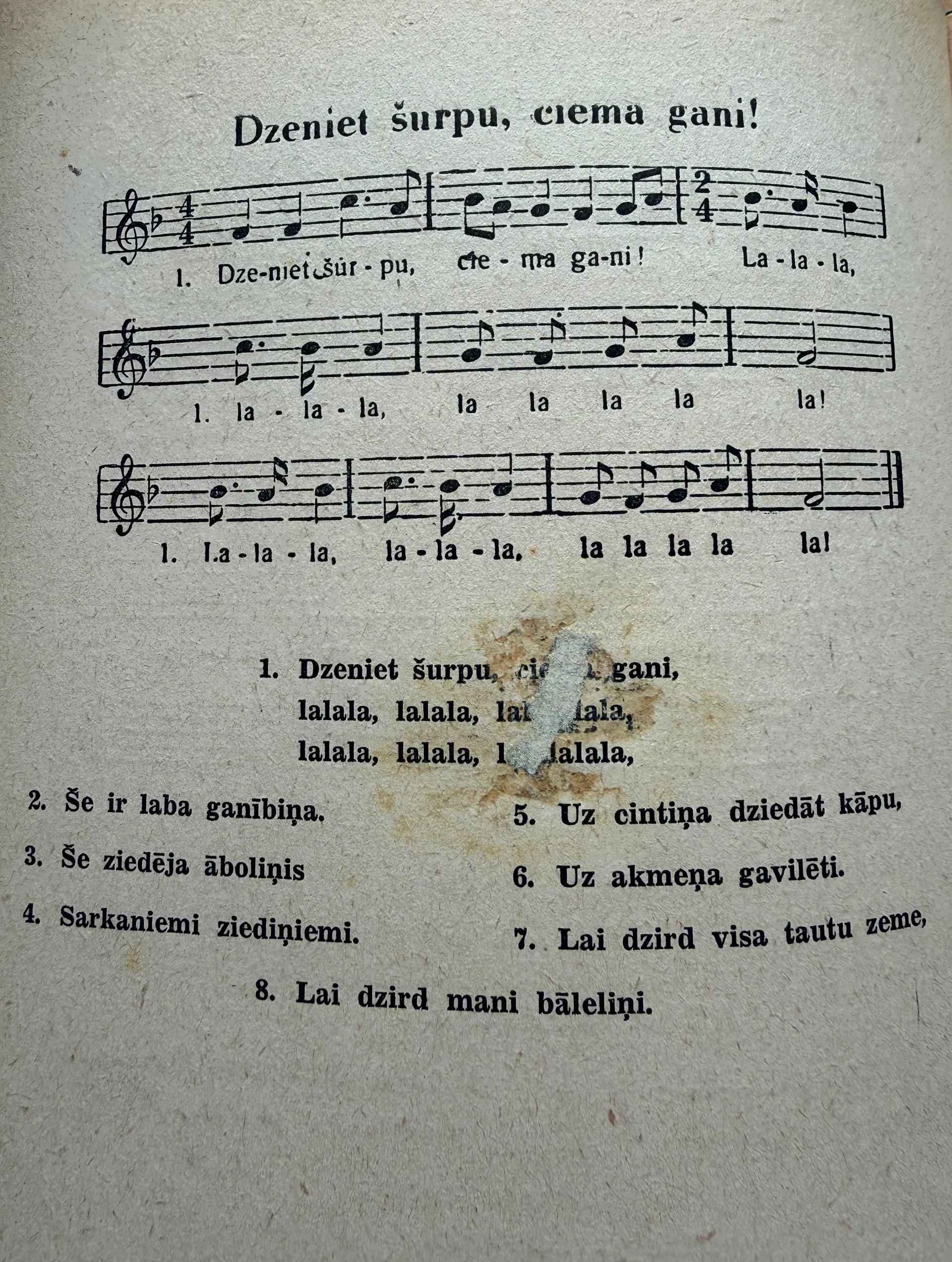 Die beiden bearbeiteten Volkslieder stammen aus einem Buch, das erstmals 1944 in Lettland und anschließend 1948 in Deutschland veröffentlicht wurde. Vermutlich wurde die zweite Auflage verwendet. Das Buch trägt den Titel „Tēvu dziesma“ (Vaters Lied) und wurde von Ludis und Irēne Bērziņi zusammengestellt. Die Lieder sind „Lempim bija pieci dēli“ (Lempim hatte fünf Söhne) auf S. 15 und „Dzeniet šurpu, ciema gani!“ (Treibt sie hierher, Dorfhirten!) auf S. 74.